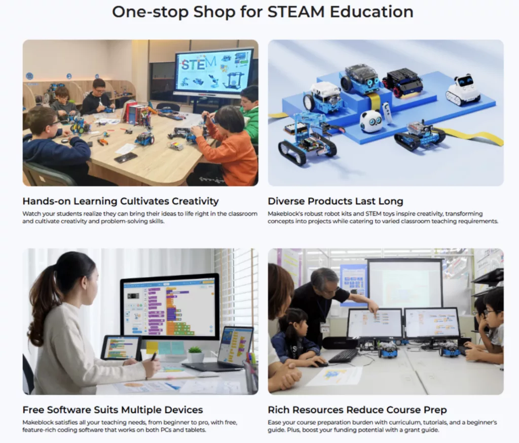 Makeblock bietet Hardware, Software und Bildungsressourcen, die Kreativität, technisches Denken und Problemlösungsfähigkeiten fördern. Die Lösungen sind für PK-12 Schüler geeignet, um Coding, Robotik und STEM praxisnah zu erleben. Mit praxisnahen Robotik-Kits, interaktiver Software und Unterrichtsmaterialien unterstützt Makeblock Lehrkräfte dabei, modernen Unterricht zu gestalten und Schüler aktiv einzubeziehen.